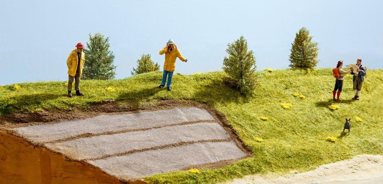Im zweiten Anwendungsszenario werden aus biobasierten Polymeren Polylactid (PLA) und Polybutylensuccinat (PBS) vollständig schadstofffreie Fasern für den Einsatz in Geotextilien hergestellt. In 25-wöchigen Lagerungsversuchen bei konstant 40 °C Temperatur und 90 Prozent relativer Luftfeuchte konnten Additive des Fraunhofer LBF den genauen Beginn und die Geschwindigkeit des Abbaus präzise regulieren. Begleitende Ökotoxizitätstests des IME bestätigten, dass während und nach dem Abbau keinerlei schädliche Stoffe freigesetzt werden. Dieser Ansatz gewährleistet langfristige Produktsicherheit.