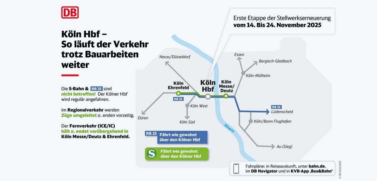 In einer zehntägigen Sperrung im November fahren S-Bahnlinien und die Regionalbahn RB 25 wie gewohnt zum Kölner Hauptbahnhof. Andere Regionalzüge werden während dieser Zeit umgeleitet oder enden bereits vor dem Hauptbahnhof. ICE- und IC-Verbindungen bedienen vorübergehend nicht den Hauptbahnhof, sondern die Stationen Köln Messe/Deutz sowie Ehrenfeld. Reisende finden alle aktuellen Fahrplandaten sowie Hinweise auf Verspätungen in der DB Navigator-App, auf bahn.de und in der KVB-App „Bus&Bahn“.